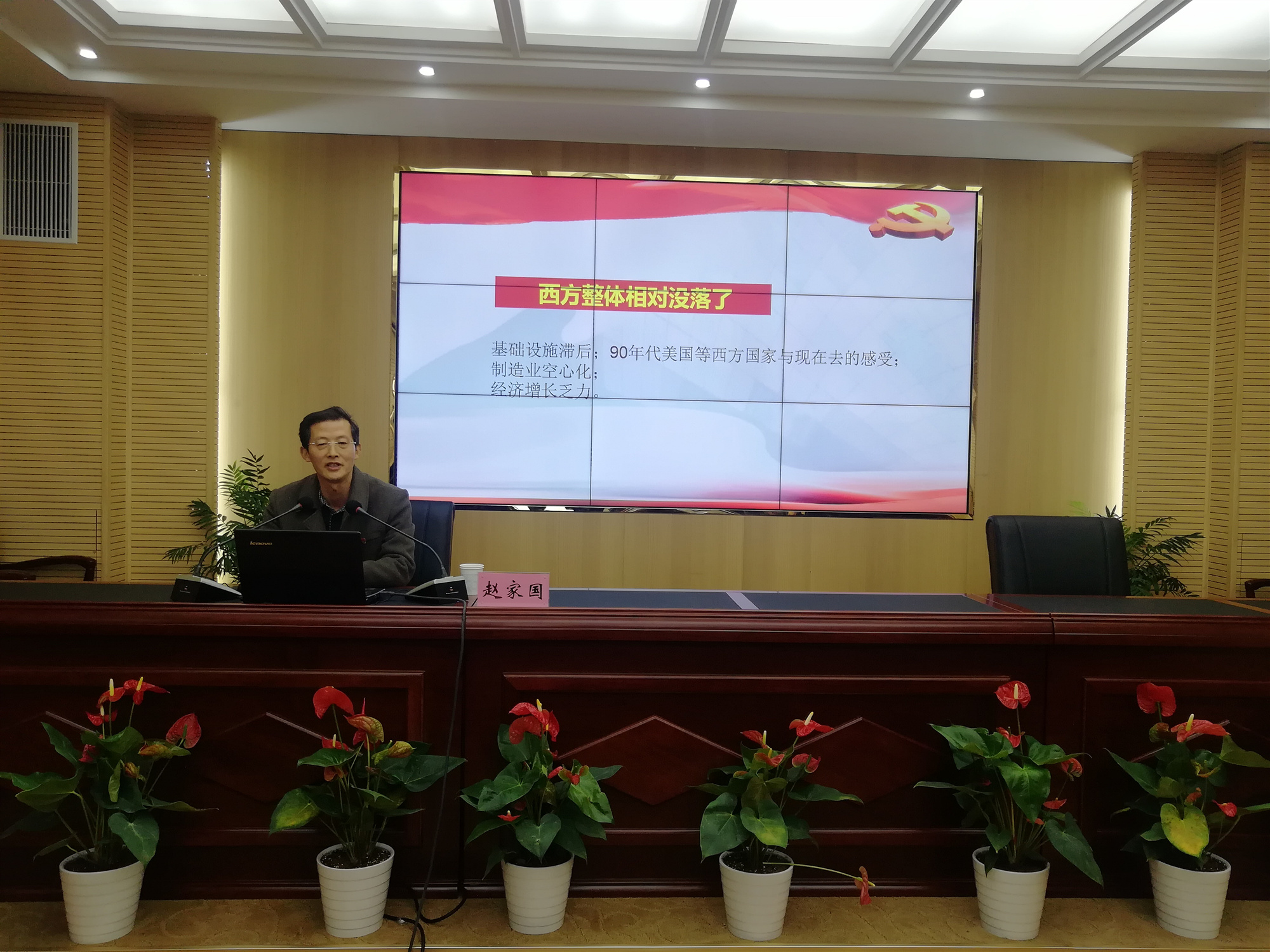 接著,趙家國教授以“12345”為提綱挈領(lǐng),結(jié)合國內(nèi)國外形勢,為大家詳細解讀了黨的十九屆五中全會精神的精髓和要義?!?”是一個重大判斷揭示未來發(fā)展環(huán)境異常復(fù)雜:《建議》提出當(dāng)前和今后一個時期,我國發(fā)展仍然處于重要戰(zhàn)略機遇期,但機遇和挑戰(zhàn)都有新的發(fā)展變化?!?”是兩個全局了然于胸謀劃未來:《 建議》指出全黨要統(tǒng)籌中華民族偉大復(fù)興戰(zhàn)略全局和世界百年未有之大變局,深刻認(rèn)識我國社會主要矛盾變化帶來的新特征新要求....。我們從這兩個大局出發(fā)來制定規(guī)劃?!?”是三個“新”揭示新征程無比豪邁:新階段、新發(fā)展理念、新發(fā)展格局。“4”是四個首次展現(xiàn)復(fù)興圖強雄心壯志:堅持創(chuàng)新在我國現(xiàn)代化建設(shè)全局中的核心地位,首次把全體人民共同富裕取得更為明顯的實質(zhì)進展作為遠景目標(biāo)提出,首次明確了建成文化強國的具體時間表,明確提出到2035年建成文化大國,首次提出確保二〇二七年實現(xiàn)建軍百年奮斗目標(biāo)?!?”是五大原則體現(xiàn)黨的領(lǐng)導(dǎo)更加成熟高超:堅持黨的全面領(lǐng)導(dǎo),堅持以人民為中心,堅持新發(fā)展理念,堅持深化改革開放,堅持系統(tǒng)觀念。
